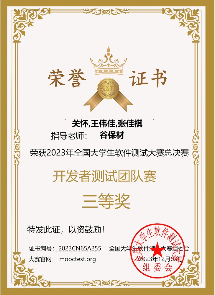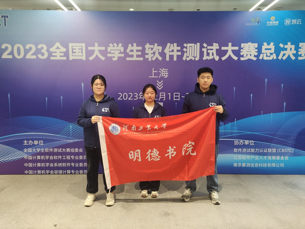 全国大学生软件测试大赛由教育部软件工程专业教学指导委员会、中国计算机学会软件工程专业委员会、中国计算机学会系统软件专业委员会等组织,本届全国大学生软件测试大赛总决赛在上海复旦大学举行,采取线下方式进行比赛。本届大赛共三个赛项:开发者测试、Web应用测试和嵌入式测试。总计吸引29个省,8406人和704队伍,总计10518人次报名参赛。书院大数据技术专业关怀、张佳祺、王伟佳,三名同学作为河南省唯一一支进入决赛的开发者测试团队,不畏挑战、勇于争先,展现了出色的团队合作和专业技能水平,荣获全国三等奖。