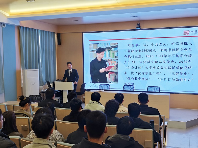 在实验楼118多功能厅举办“明德笃行·青春领航”国奖励志宣讲活动。本次活动由谷保材老师主持,学工办主任薛晓晓出席并讲话,2024年国家奖学金获得者曹仟喜作主题分享,书院2024级专升本及其他专业学生代表100余人参加。