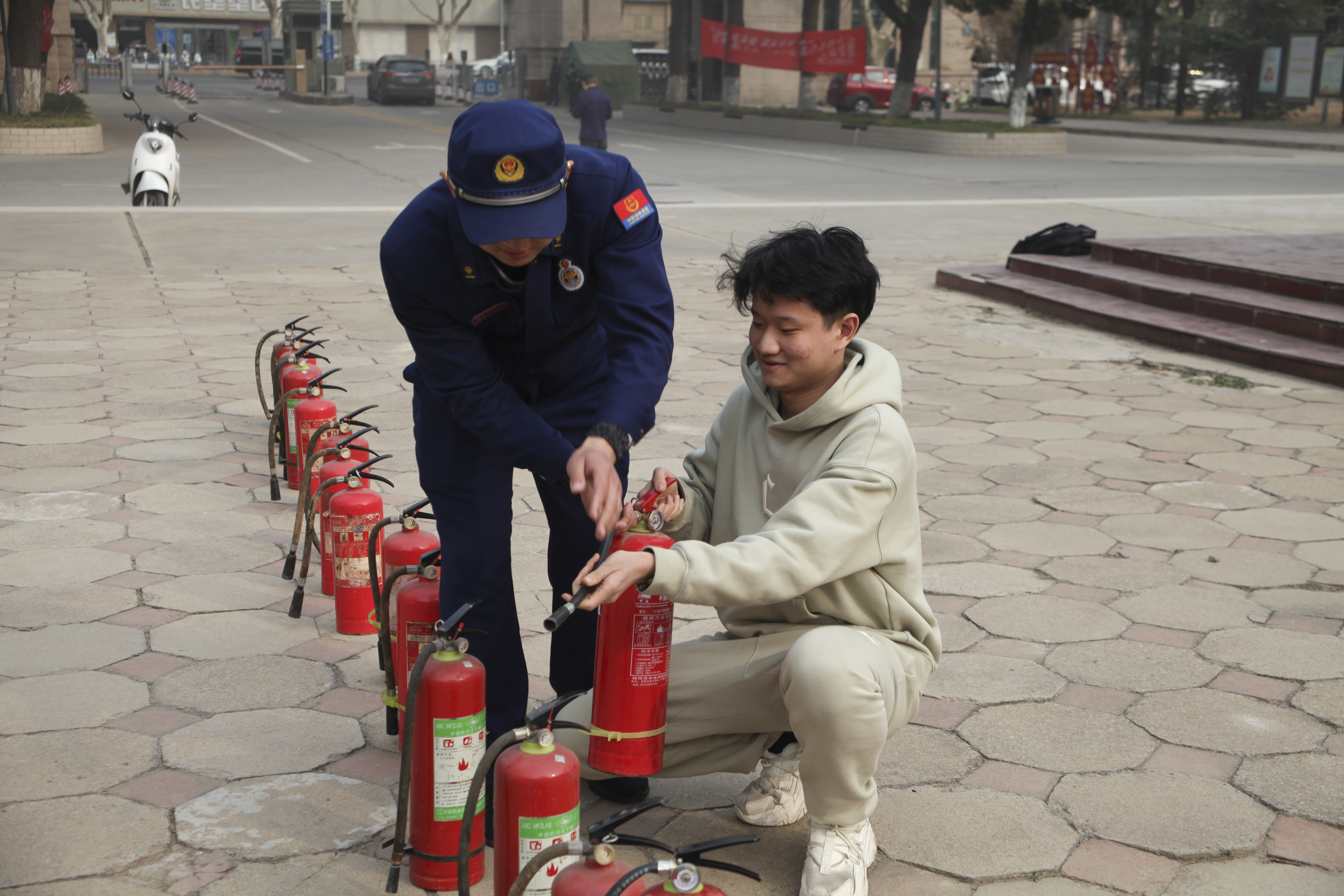 随后,在消防救援大队的指导下,组织师生在喷泉广场开展了消防演练。消防官兵现场讲解了干粉灭火器、二氧化碳灭火器、水基型灭火器的区别和使用方法,重点强调了消防标识识别方法、消防通道疏散要点、火灾疏散的动作要领和注意事项等内容,并邀请师生代表体验如何使用灭火器、消防栓等灭火用具,组织模拟教学楼的人员疏散演练,帮助广大师生进一步提高消防安全意识,掌握火灾时自救互助技能。