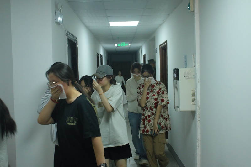 随后消防演练环节,消防中队指战员们深入浅出地向大家讲解火灾的形成过程,火灾中产生浓烟的危害以及防火灭火、逃生自救的方法和注意事项。上午11时,校区学4宿舍楼模拟发生火情,宿管人员发现并发出警报,校区各部门立即启动应急预案,组织人员疏散逃离,学生们按照火场逃生疏散演练技巧,分别采用湿毛巾和衣角捂住口鼻弯腰低姿前行,并沿着楼道和楼梯快速通过各个安全出口,有序离开宿舍楼,疏散到学校宽敞安全地带。