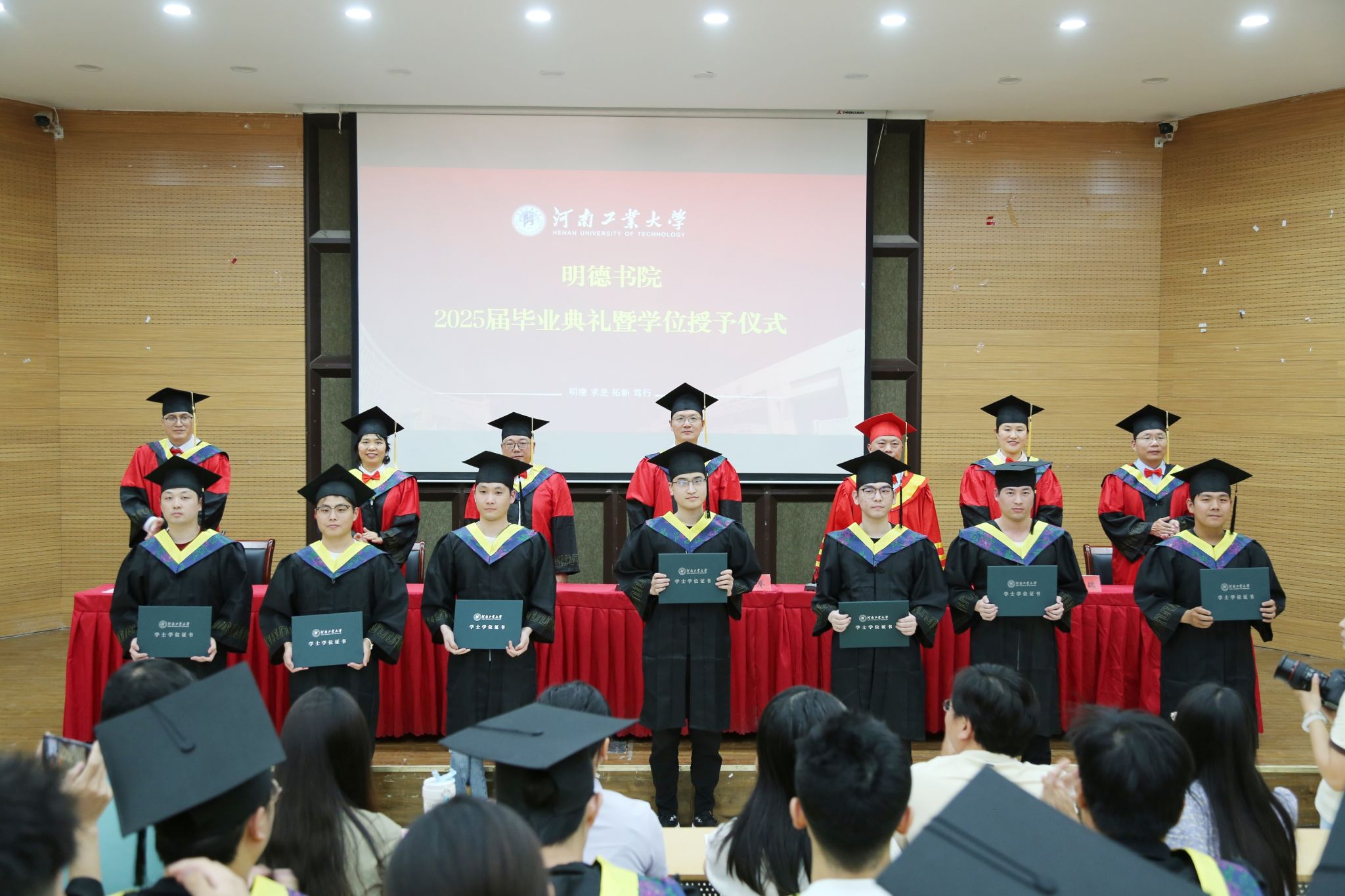 在激昂的校歌声中,书院领导班子成员为全体本科毕业生逐一行拨穗礼、颁发学位证书并合影留念,为受表彰的优秀毕业生代表颁发了荣誉证书,同时为2025届毕业生校友联络员颁发了聘书。书院精心为毕业生们准备了毕业礼物,饱含着对毕业生们的深切祝福和美好期望,希望他们带着这份温暖踏上新的人生旅程。