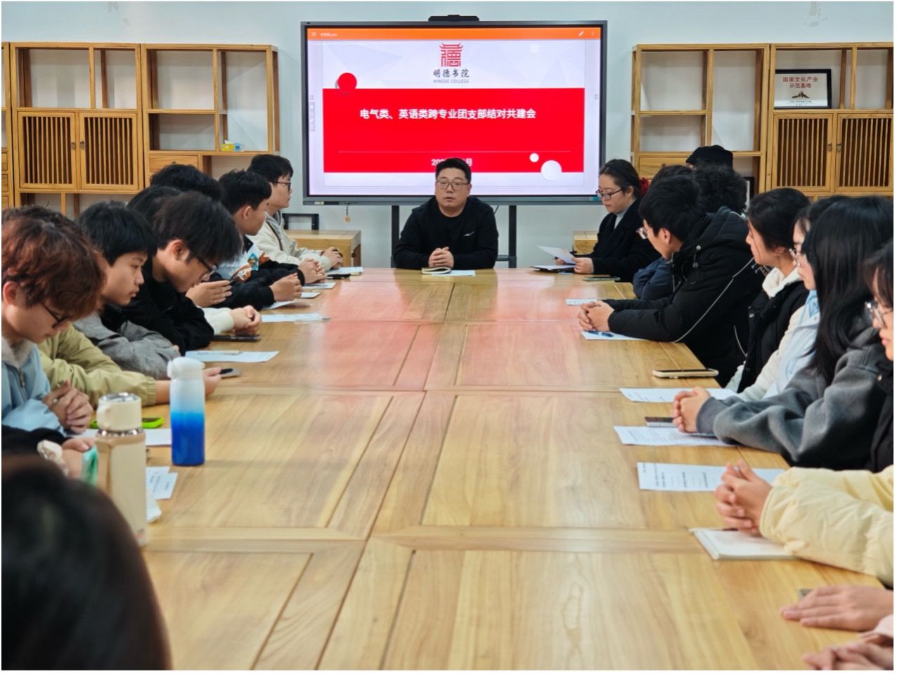 跨专业团支部结对共建工作在嵩山路校区实验楼418教室的明德社区人文素养工坊正式启动。书院党委副书记刘飞翔、团委书记刘振伟、辅导员李国根共同参与了书院首个结对团支部——电气工程及其自动化专业2502团支部与英语专业2502团支部的主题团日活动。