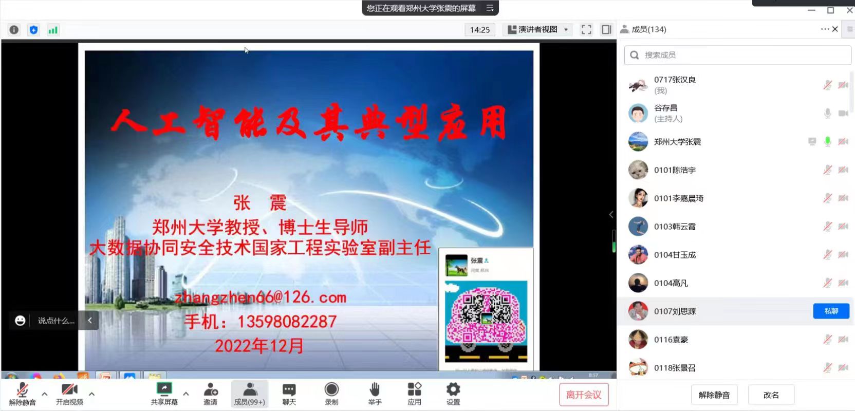 张震教授围绕“人工智能及其典型应用”这一主题展开报告,以“城市大脑”作为切入点,以杭州阿里城市大脑为例,说明了人工智能的“弱人工智能”、“强人工智能”、“超人工智能”三种形态,鼓励同学们多关注政府及智库发布的行业标准,从多个维度引导同学们全面了解人工智能行业。讲坛着重从无人驾驶、城市大脑、医疗影像、智能语音、智能视觉、AI智能助理等六个方面介绍人工智能的典型应用;从视觉、自然语言理解与交流、认知与推理、机器人学、博弈与伦理、机器学习等六个方向总结人工智能学科的发展前景;剖析了利用人工智能(AI)与物联网(IoT)相结合,实现不同智能终端设备之间、不同系统平台之间、不同应用场景之间的互融互通,万物互融的未来。报告结束后,师生结合讲座内容在线上踊跃提问、积极互动。
