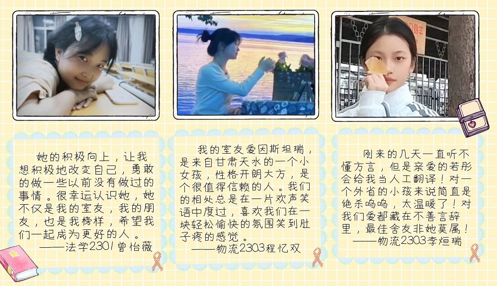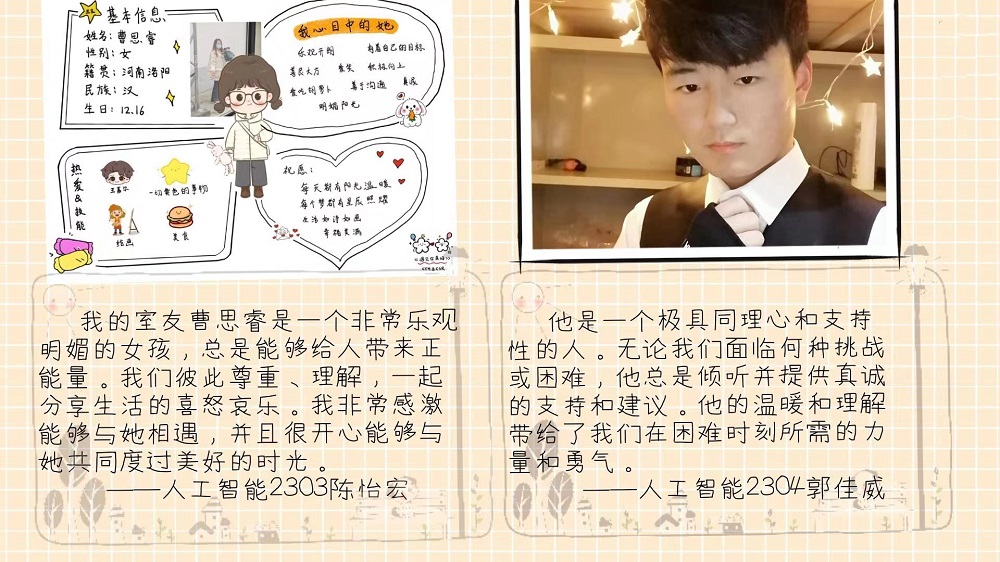 与此同时,线上活动也在同步进行。同学们通过为室友制作简历和短视频,不仅为室友送去了鼓励,也让自己成为了一个内心有光亮的人。通过参与活动,同学们发现了身边人的美好闪光点。经过学生投票和多名老师综合评议,人工智能2303班陈怡宏等2名同学获得一等奖,物流2301班程忆双等6名同学获得二等奖,法学2305班崔瑞瑞等8名同学获得三等奖,所有获奖者均将获得精美礼品一份。