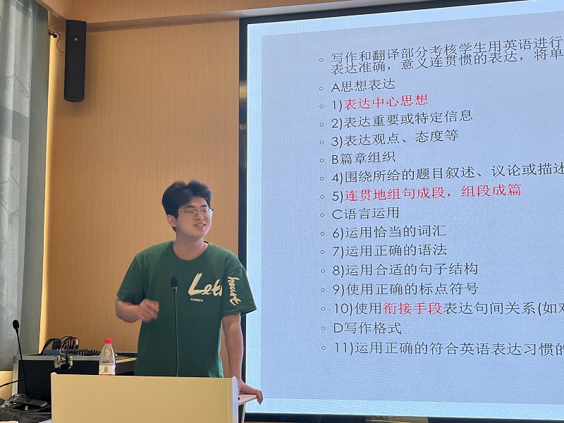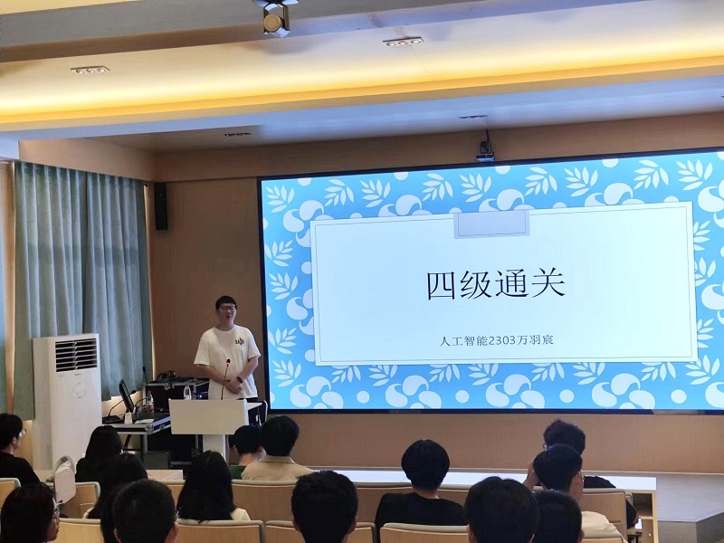 万羽宸和刘赟鹏同学向在场的同学们详细介绍了四级考试的内容、分值比例、做题流程以及各题型的注意事项。他们通过实际经验分享,为同学们提供了科学有效的备考方法和技巧。他们深入浅出地解释了四级考试的听力、阅读、写作和翻译等题型,针对每个题型进行了深入剖析,帮助同学们理解题目要求和解题技巧。他们还结合自身备考经验,分享了一些应对考试压力和时间管理的建议,为同学们提供了宝贵的备考经验。