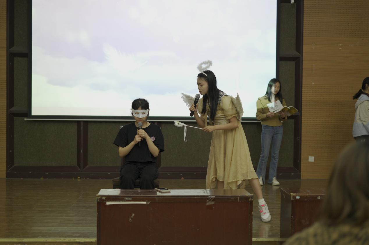 第三组“男生女生向前冲”队带来的作品是《震惊!戴着面具的人》,该作品用音乐剧的形式讲述了一个社恐女生,不知如何拒绝,不敢表达自己的观点。小天使通过充满正能量的歌声带她再次经过那些场景,她学会了克服恐惧,而且大方自信地表达自己,最后她完成蜕变,面具摘下,华丽转身,开始带领全场跳舞,欢乐的舞姿也将全场的气氛带动了起来。