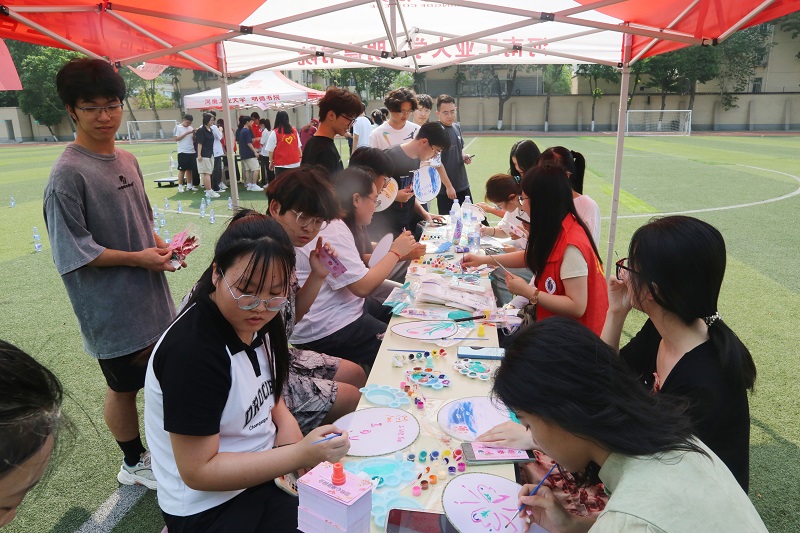 在喜笑颜开园区,同学们从志愿者手中领取空白口罩和水粉颜料,通过发挥自己的想象力对口罩进行改装创造,用水粉画出自己心仪的图案,释放日常生活中的压力;在喜气冲天园区,志愿者为参赛同学分发空白扇子,同学们通过互相交流制作扇子,拉近彼此关系,以做手工的方式排解烦恼,在即将迎来的夏日里拥抱好心情;在同心协力游戏中,同学们分工合作,佩戴眼罩的同学根据另一名同学的指示避开重重障碍前进,在到达终点时领取贴纸,促进同学间的沟通交流;心算迷航游戏中,同学们激发大脑潜能,在游戏区激情运算,大大增加了同学们的感知力、记忆力和注意力;套圈活动中,同学们用有限的圈环去套场地内的矿泉水,锻炼手眼协调能力和目测能力,套中三个及其以上的同学还能兑换自己想要的奖品。