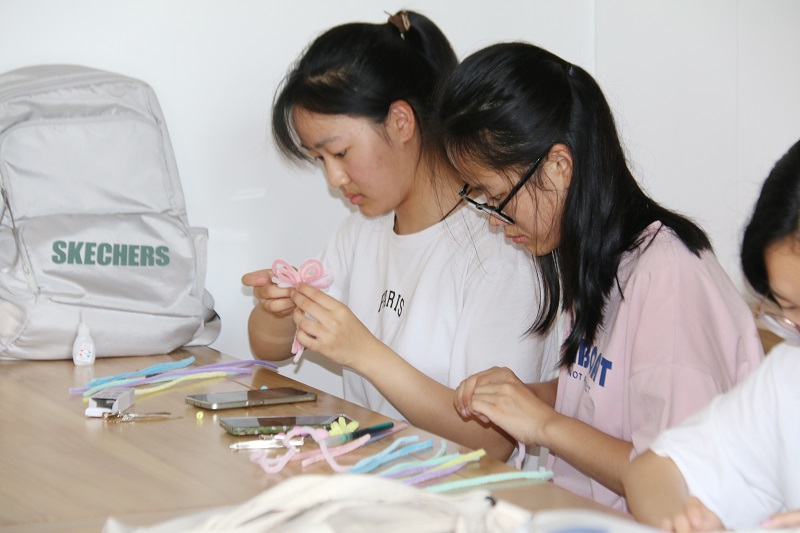 活动开始,同学们首先观看了创意手工扭扭棒的制作视频,在了解完扭扭棒的制作方法后,同学们跃跃欲试,想要制作属于自己的扭扭棒手工艺品。制作过程中,有一些同学遇到了困难,但是并没有因此放弃作品,而是寻求帮助,身边的同学们和志愿者也热心地为他们解决问题。还有一些同学组队进行创作,大家通过自己的奇思妙想和互相交流意见,一件件别具匠心、富有童趣的创意作品在同学们灵巧的手中诞生。