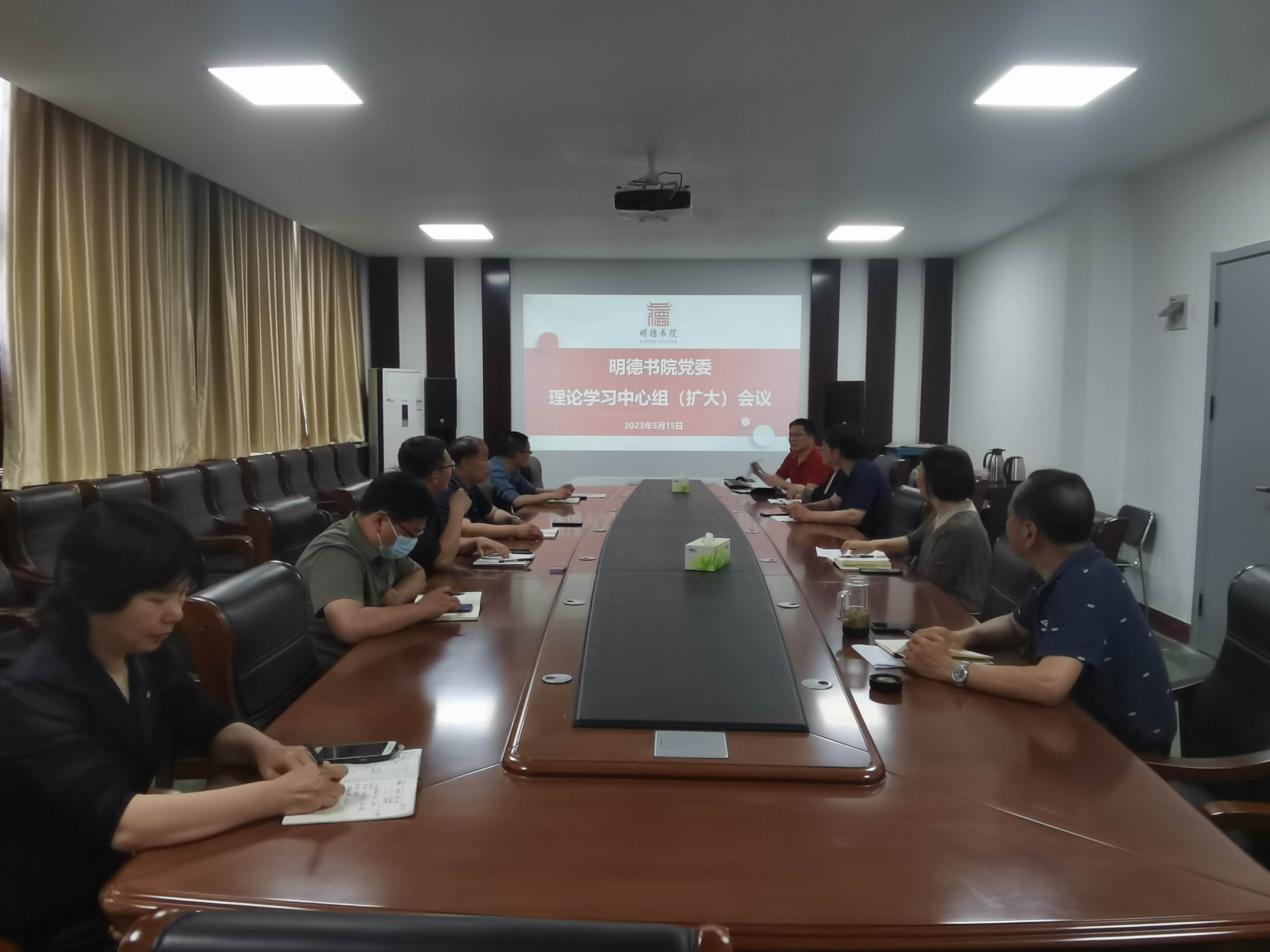 党委理论学习中心组在办公楼207会议室召开中心组(扩大)会议。书院领导班子及各科室科长参加了本次学习。会议由院党委书记魏朝举主持。