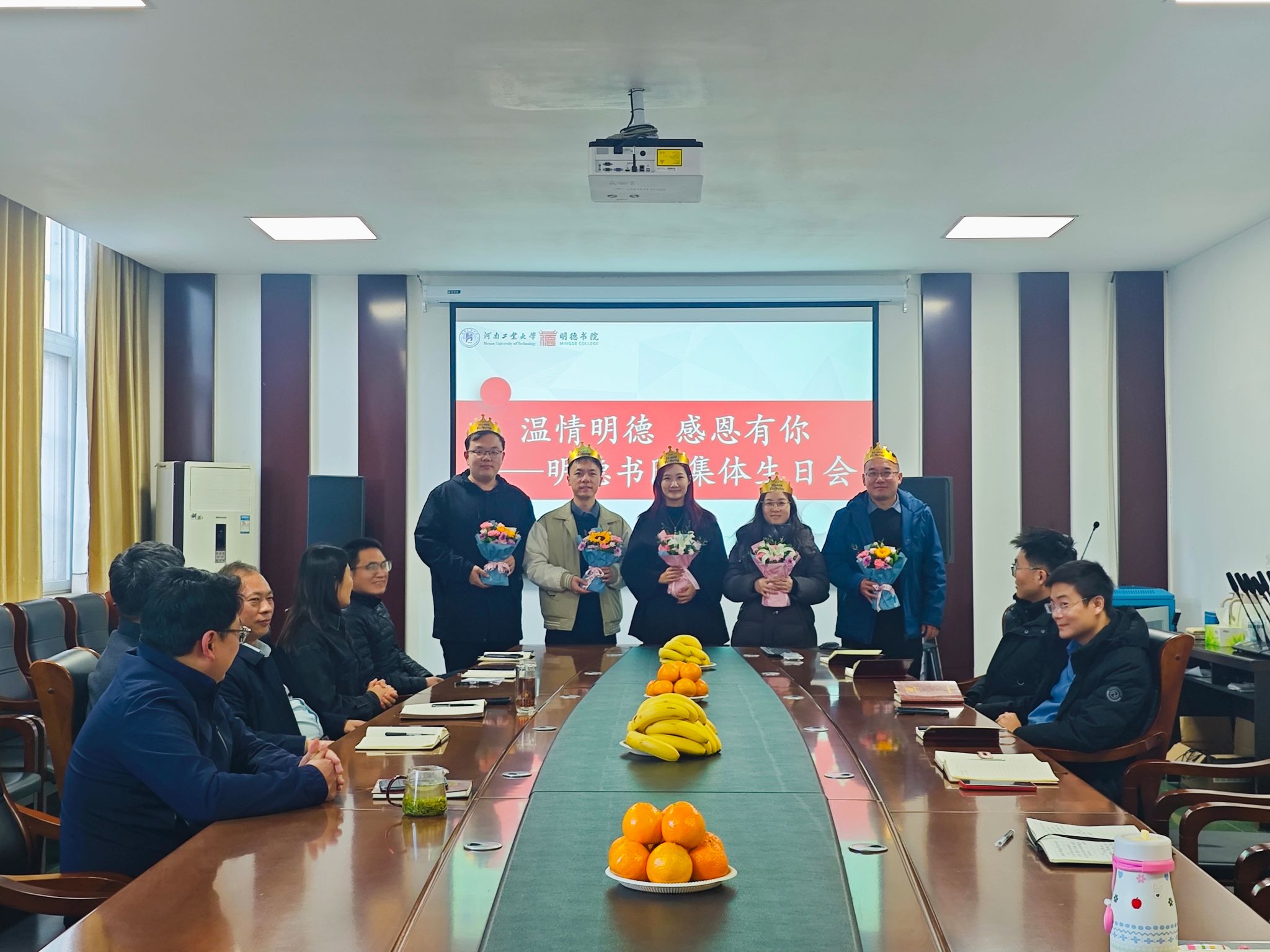 在207会议室为2025年度逢十生日的教职工举办“温情明德,感恩有你”集体生日会。书院领导、教职工齐聚一堂,在温馨的氛围中共享生日喜悦,共话未来发展。