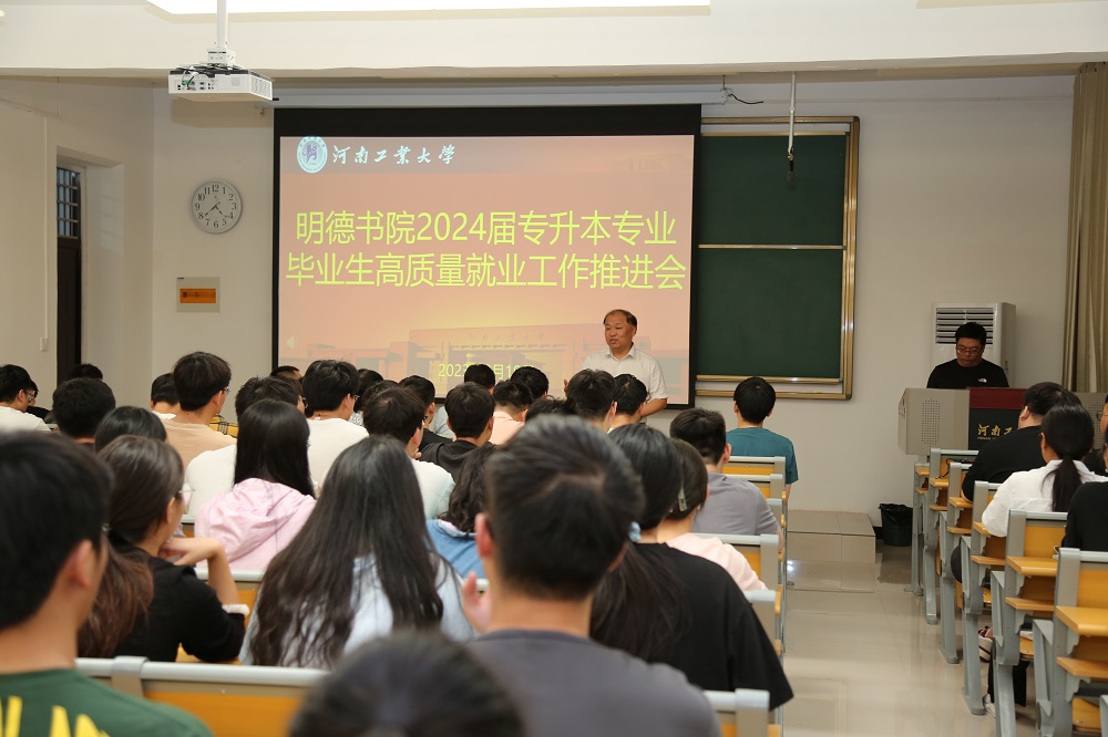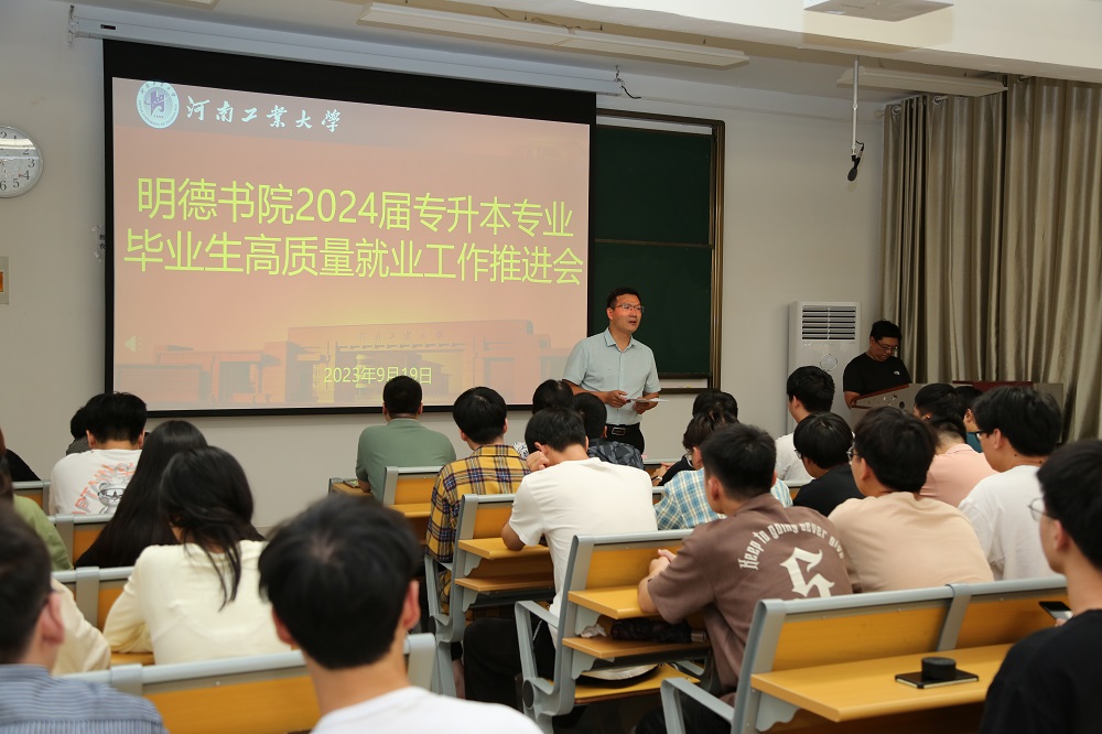 在嵩山路校区实验楼召开2024届专升本毕业生高质量就业工作推进会。书院党委书记魏朝举、院长谷存昌、副院长张雪萍、党委副书记刘飞翔、毕业生辅导员王欢和270名2024届专升本毕业生参加会议,会议由刘飞翔主持。本次会议设有一个主会场(206教室)和一个分会场(204教室)。